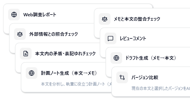 執筆プロセスに合わせてAIが支援。下書き生成から推敲、レビューまで。