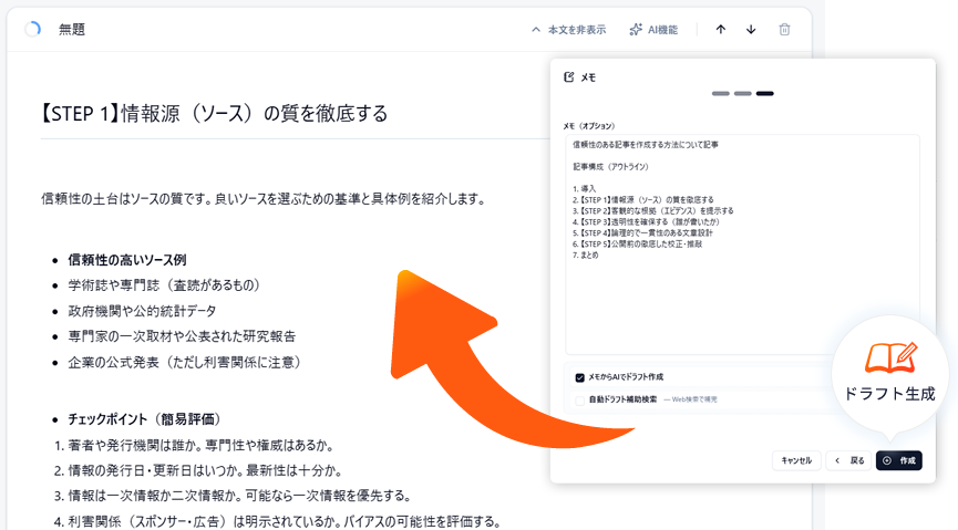 アイディアのメモやざっくりとしたアウトラインがあるだけで、ボタン一つで素早く初稿を書き上げます。「何から書き始めればいいかわからない」という時の、心強い最初の一歩をサポートします。